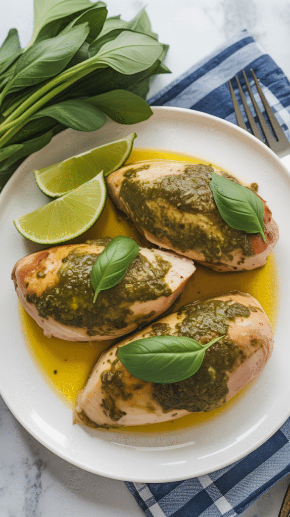 Baking keeps it juicy, and the pesto adds tons of flavor without heavy calories. Serve it with quinoa or a side of greens.