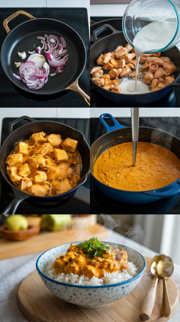 • Bring to a gentle simmer and cook for 10–12 minutes, until chicken is fully cooked and sauce thickens.