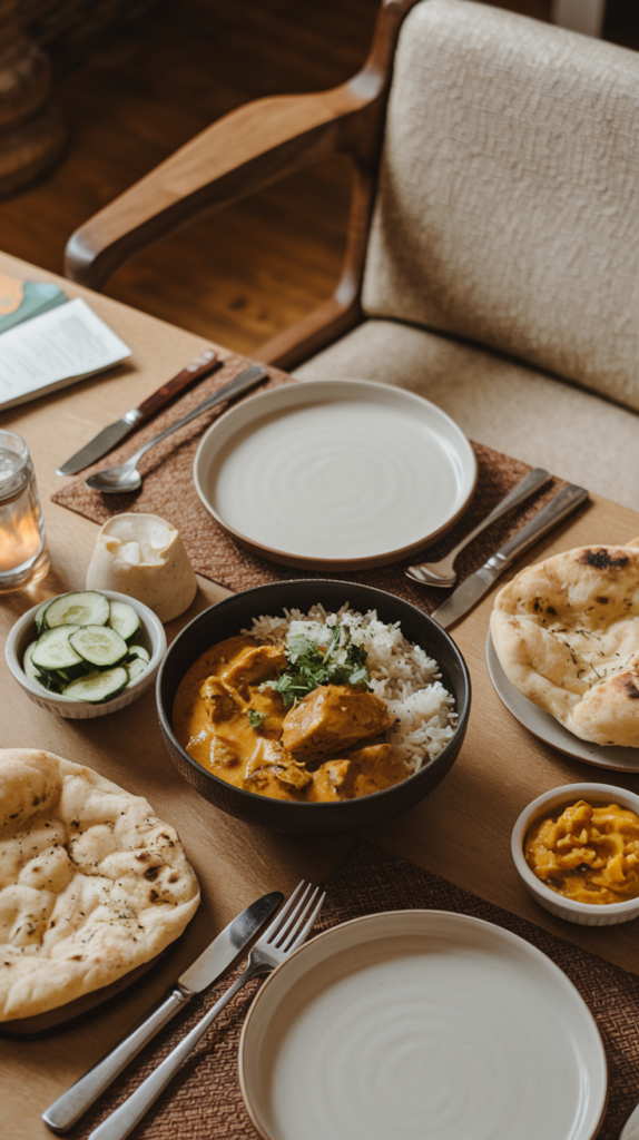 • Warm garlic naan for scooping up curry.