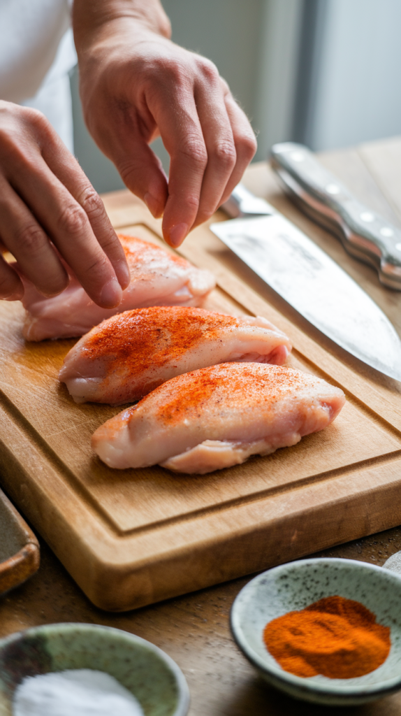 Pat those chicken breasts dry (because moisture is the enemy of golden-brown searing). Season both sides generously with salt, pepper, and paprika.
