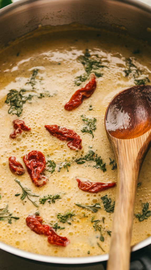 Add sun-dried tomatoes, Italian seasoning, and red pepper flakes. Simmer for 2โ€“3 minutes to thicken slightly.