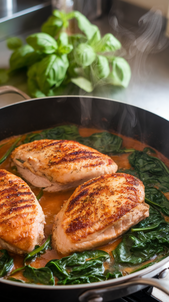 Toss in the spinach and let it wilt into the sauce. Return the chicken to the pan, spooning the sauce over the top. Simmer for another 2 minutes to let all the flavors become best friends.