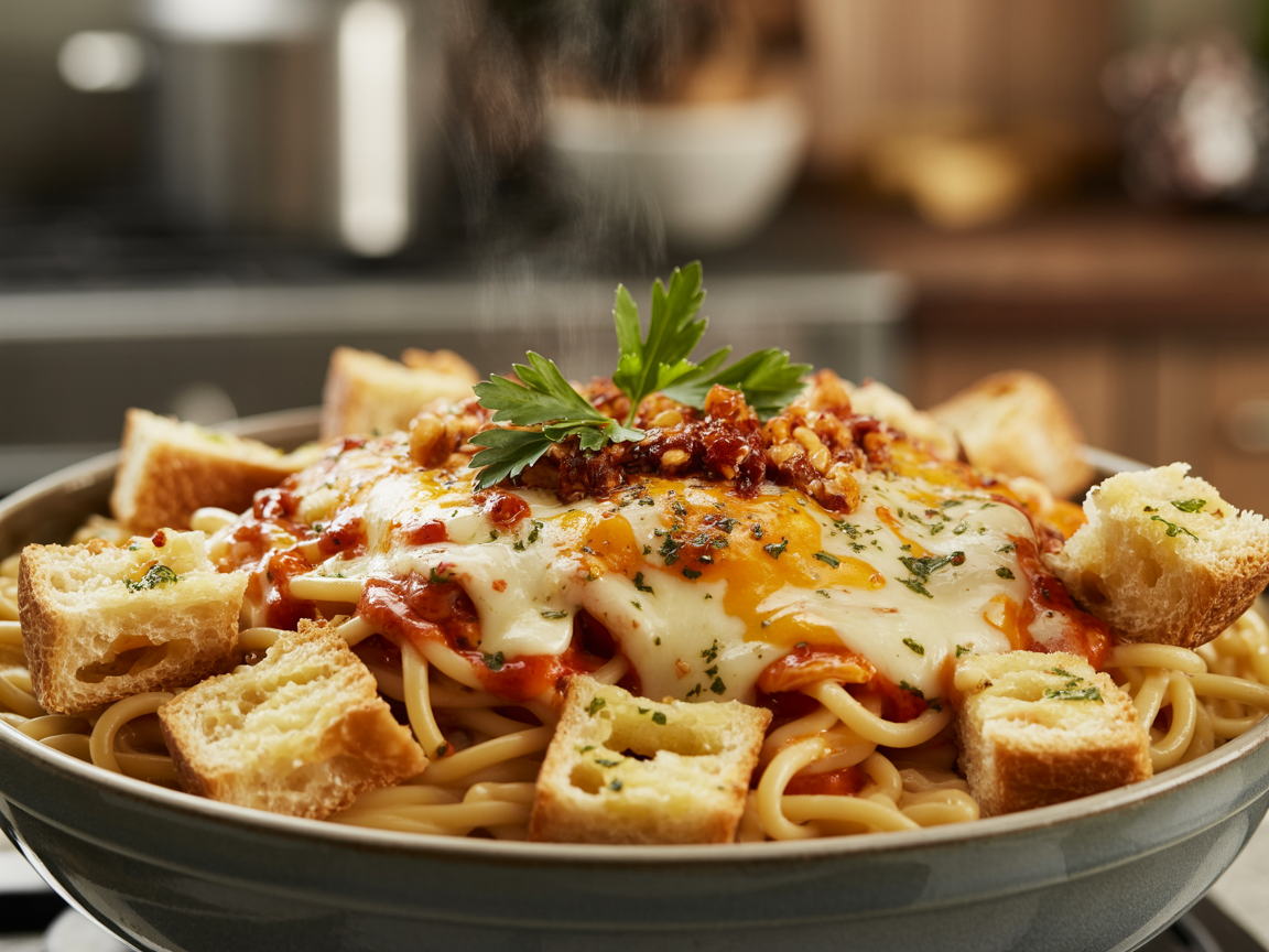 This dish works because it combines multiple textures and flavors in one bowl. You get crispy bread, creamy sauce, and stretchy cheese in every bite. That combination hits hard.