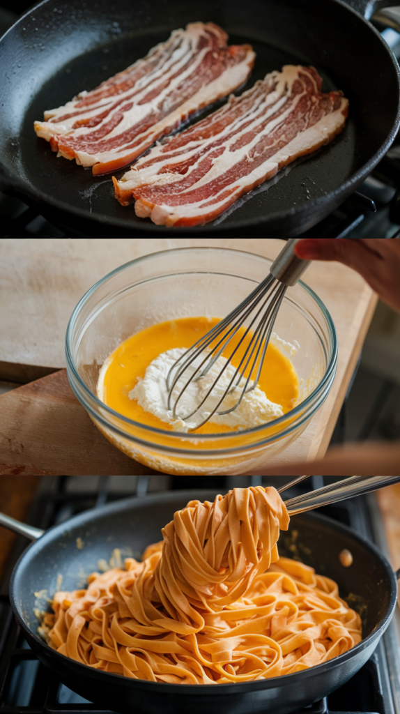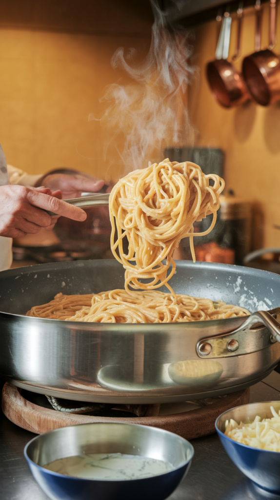 - Use room-temperature eggs → Cold eggs can shock the pasta and cause lumps.